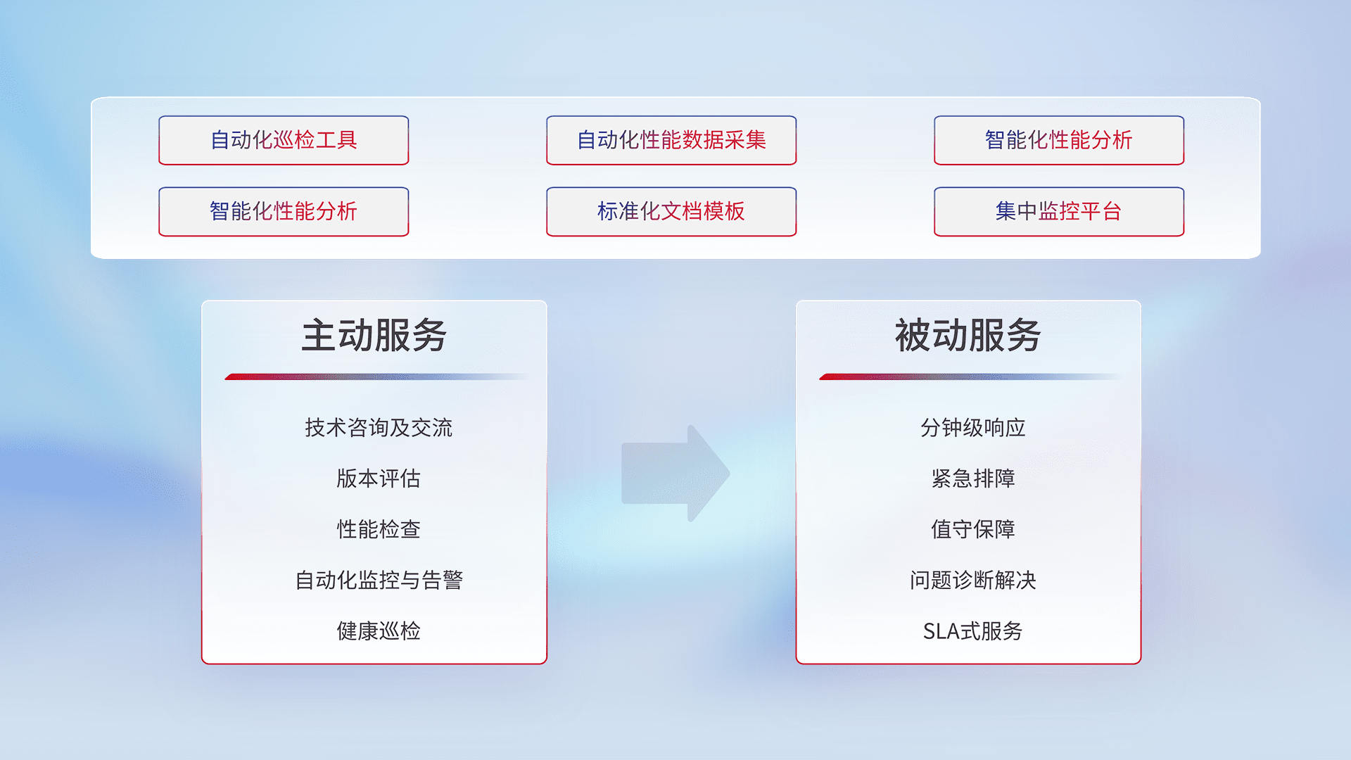 智能化工具和标准化文档,,,保障服务质量,,,提供主动服务(包含技术咨询、、、版本评估、、性能检查、、、自动化监控与告警、、、健康巡检)和被动服务包含(分钟级响应、、、、紧急排障、、、值守保障、、问题诊断解决、、SLA服务)。。。。